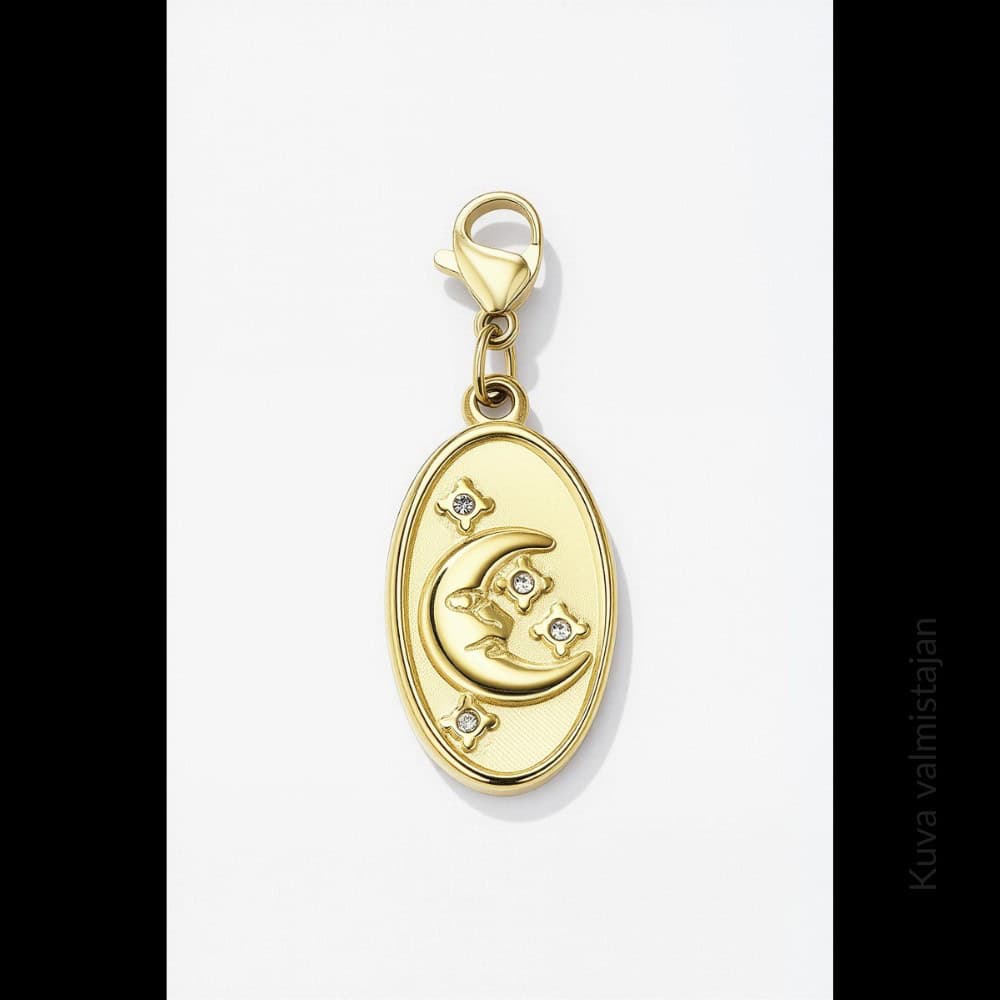 Soikea kuunsirppi charmi, jota voi käyttää esimerkiksi saman suunnittelijan ranneketjussa (saatavilla erikseen). Sopii myös riipukseksi, avaimiin, vetoketjuun tai laukkukoruksi. Riipuksen koko noin 2,5 cm + rapulukko. Materiaali kullanväristä ruostumatonta terästä.