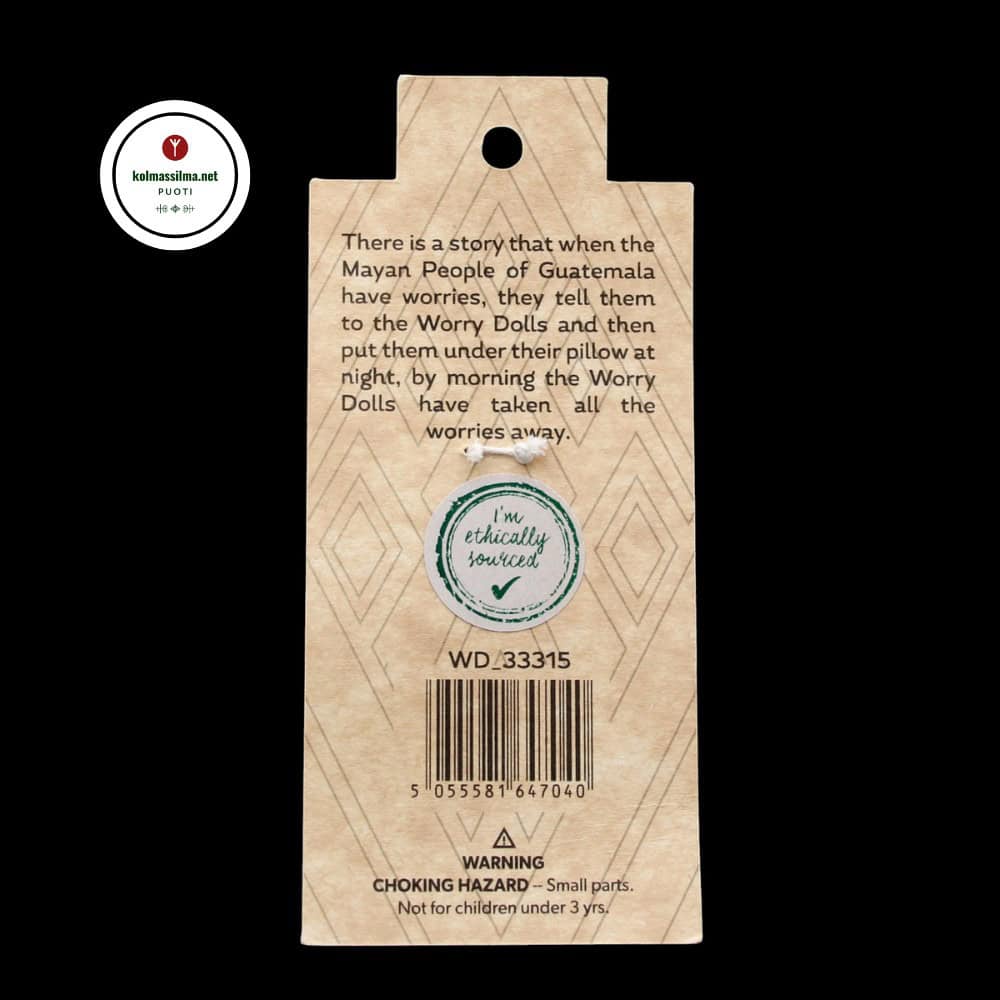 Perinteen mukaan huolinukeille kuiskataan huolet ennen nukkumaanmenoa, asetetaan nuket tyynyn alle ja yön aikana huolinuket ovat käsitelleet murheet pois. Lohduttava ja symbolinen lahja niin lapsille kuin aikuisillekin. Käsintehty Guatemalassa perinteisistä kankaista ja materiaaleista.
