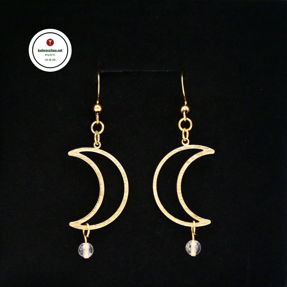 Kulje kuun valaisemaa polkua kullanhohtoiset korvikset korvissa. Keveissä korvakoruissa Puolikuu riipukset, joissa pienet kivihelmet. Avoimet koukut, mukana silikoni stopparit. Kuuriipusten korkeus noin 2,5 cm.