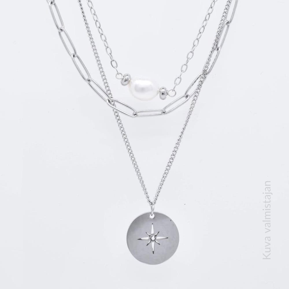 Sirossa kolminkertaisessa kaulakorussa läpileikattu Pohjantähti riipus. Materiaali ruostumatonta terästä. Riipuksen halkaisija 1,5 cm. Säädettävä ketju yhtenäisessä lukossa. Mitat: pisin ketju noin 50 cm, lyhin noin 42 cm, lisäksi säätövara +5 cm.