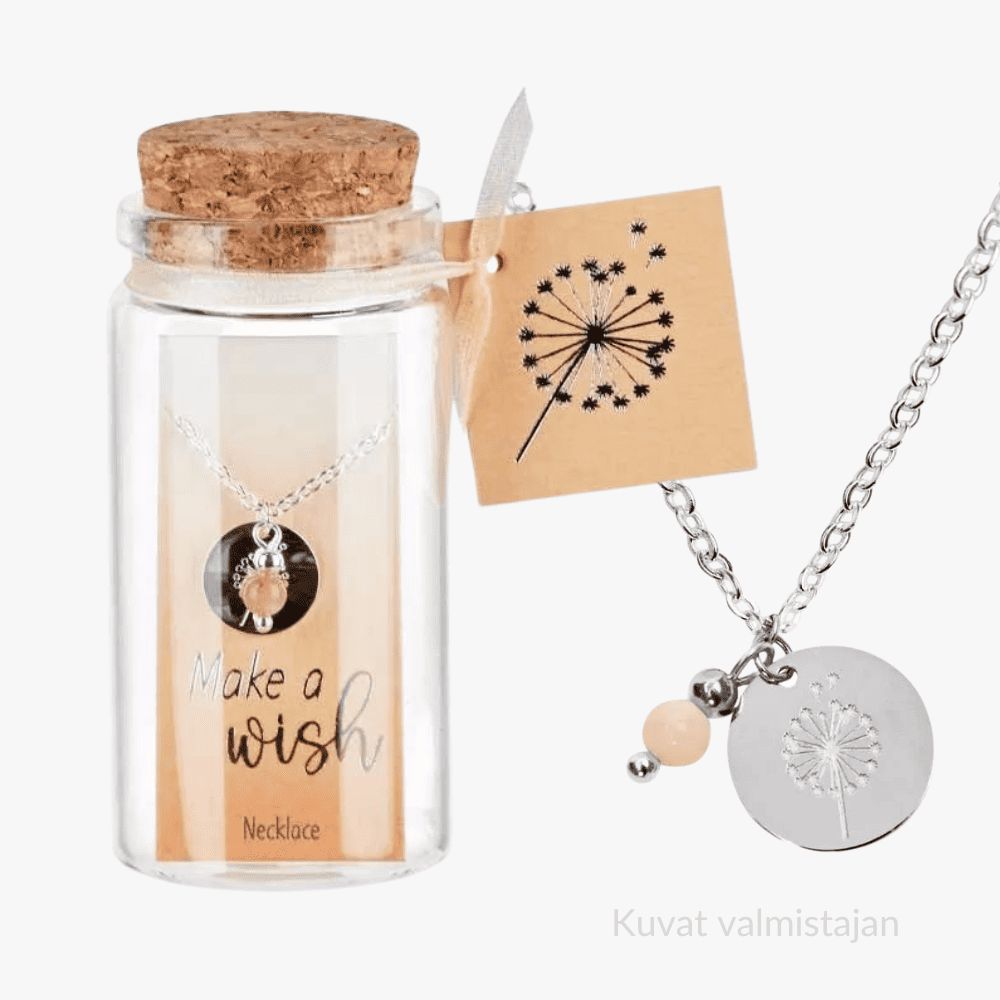 Sievään toivomuspulloon pakattu kaulakoru jossa Dandelion symboli ja pieni voimakivi. Laatan taustalla teksti ”Make a Wish”. Säädettävä ketju noin 42+5 cm. Mukaan laitetaan musta samettipussi, jota voi käyttää myös lahjapussina.