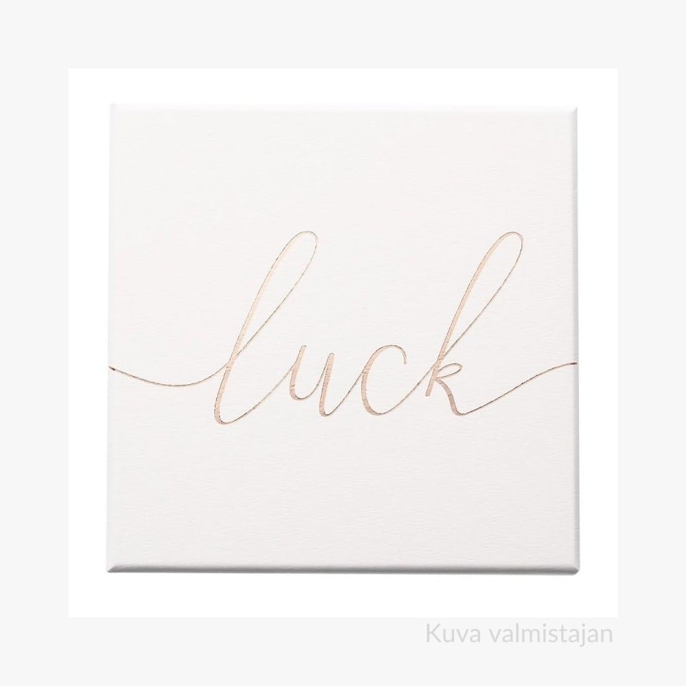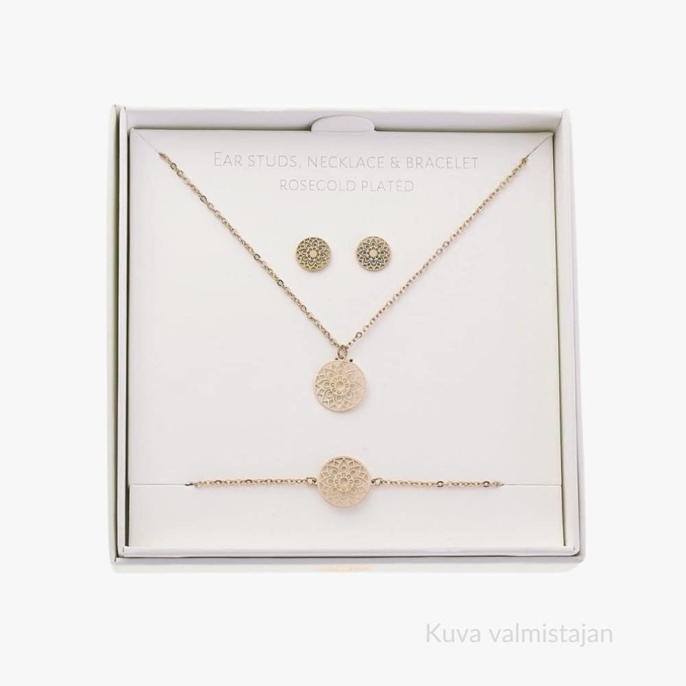 Lahjarasiassa Mandala of Luck korut: Kaulakoru, rannekoru ja korvakorut. Materiaali ruusukullattua ruostumatonta terästä. Kaulakorun riipuksen halkaisija 1,8 cm. Rasian koko 12×12 cm. Sirojen korujen lahja naiselle.