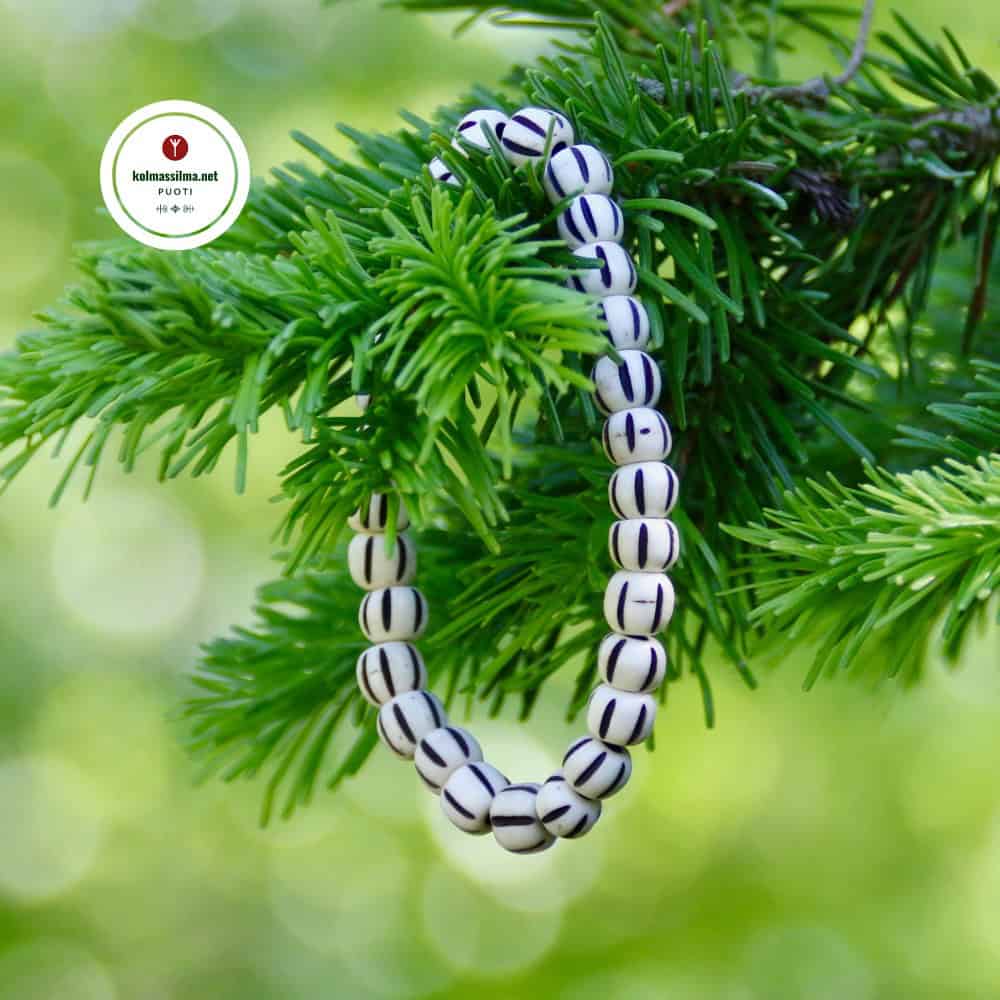 Joustava rannekoru käsintehdyistä ja kaiverretuista luuhelmistä. Helmien koko noin 8 mm. Sisämitta venyttämättä noin 17,5 cm. Materiaali puhvelin luuta.