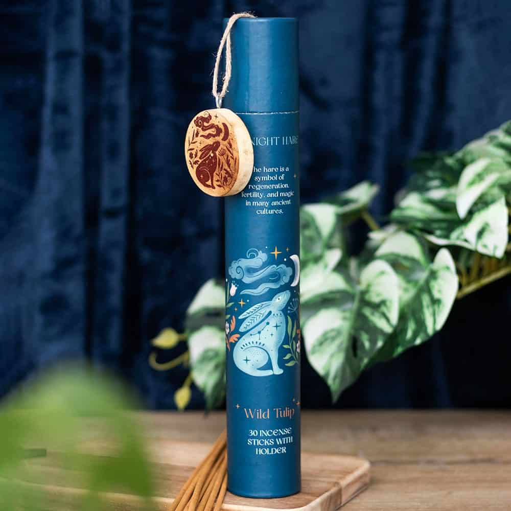 Ihastuttavat suitsuketikut 30 kpl. Kätevässä putkilorasiassa kuuta katsova jänis petroolinvihreällä pohjalla. Mukana kuvioitu puinen suitsukealusta. Pakkauksen korkeus 29 cm, alustan halkaisija 5 cm.
