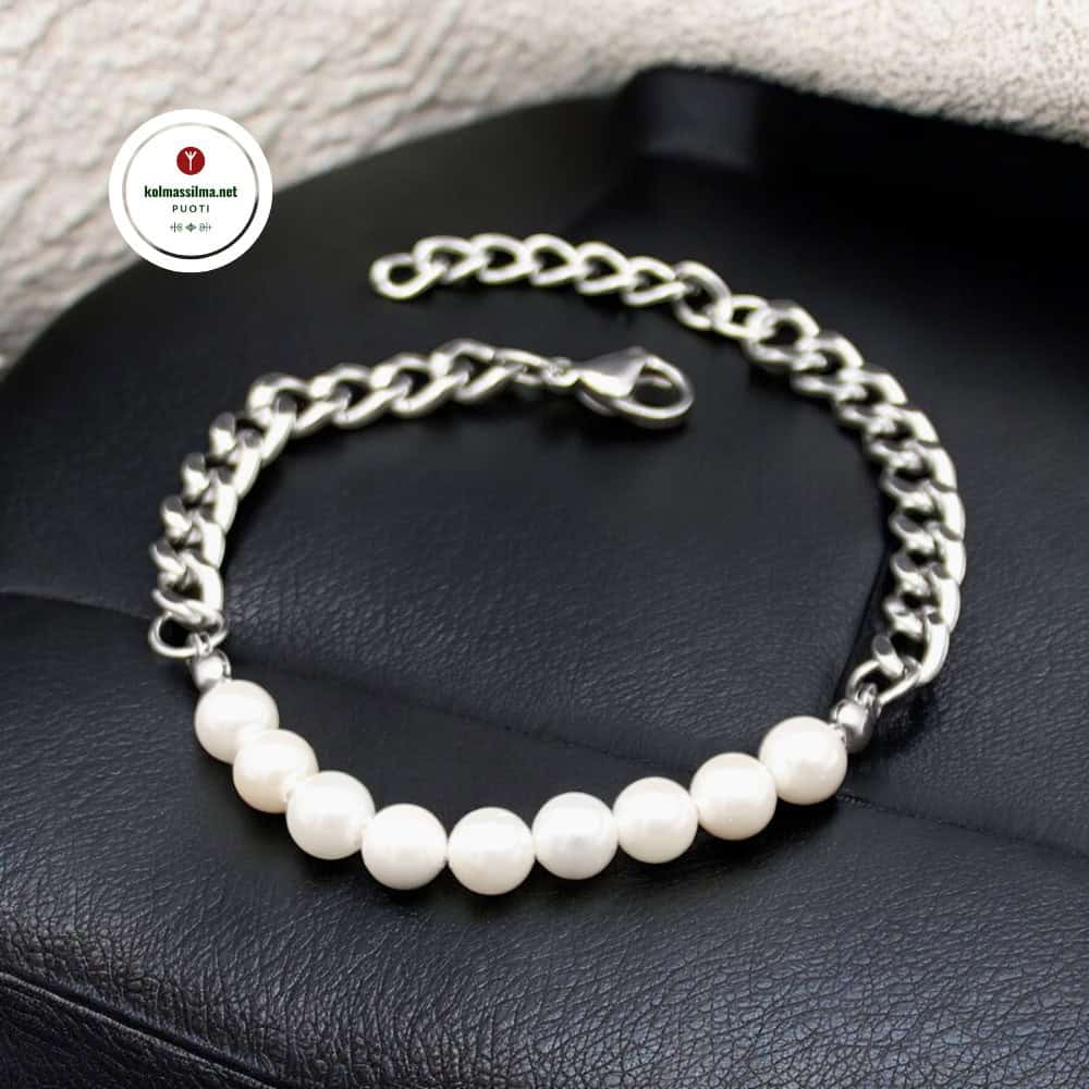 Rannekorussa 6 mm valkoiset helmet. Metalliosat ruostumatonta terästä, helmet laadukkaita synteettisiä helmiä (simpukoita ei vahingoitettu). Säädettävä pituus noin 18 cm + 3 cm.