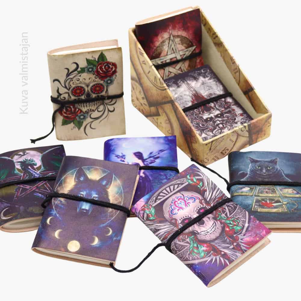 Pientä muistikirjaa on saatavilla myös muilla kansikuvilla. Materiaalit: Olemme tarkastuttaneet vihkot kotimaisella nahka-asiantuntijalla, joka totesi kannet pintakäsitellyksi haljasnahkaksi.