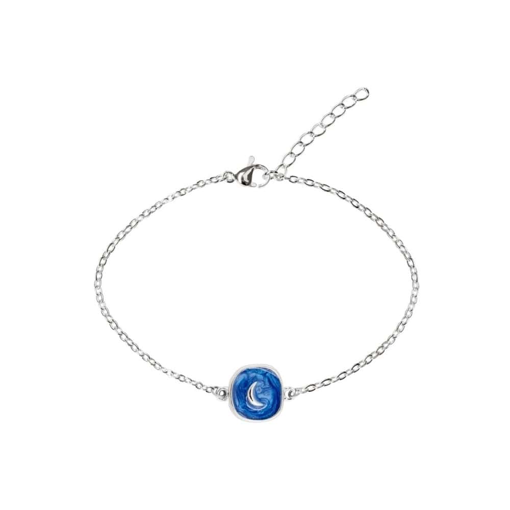 Sirossa rannekorussa sininen emaloitu riipus, jossa Kuunsirppi symboli. Säädettävä pituus 17+3 cm. Materiaali nikkelivapaata korumetallia. Ranneketju on kiinnitetty pieneen kaksiosaiseen korttiin, jossa hopeafolioidut yksityiskohdat sekä teksti ”I love you to the moon and back”.