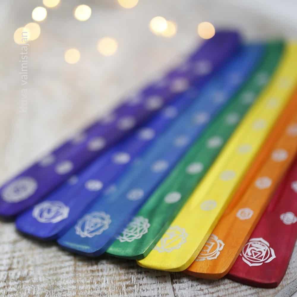 Hyvälaatuisessa suitsuketelineessä kaiverrettu ura, johon suitsukkeen tuhka kerääntyy siististi. Materiaali maalattua mangopuuta, hopeanväriset chakrojen symbolit. Pituus noin 26 cm, leveys 3,5 cm.
