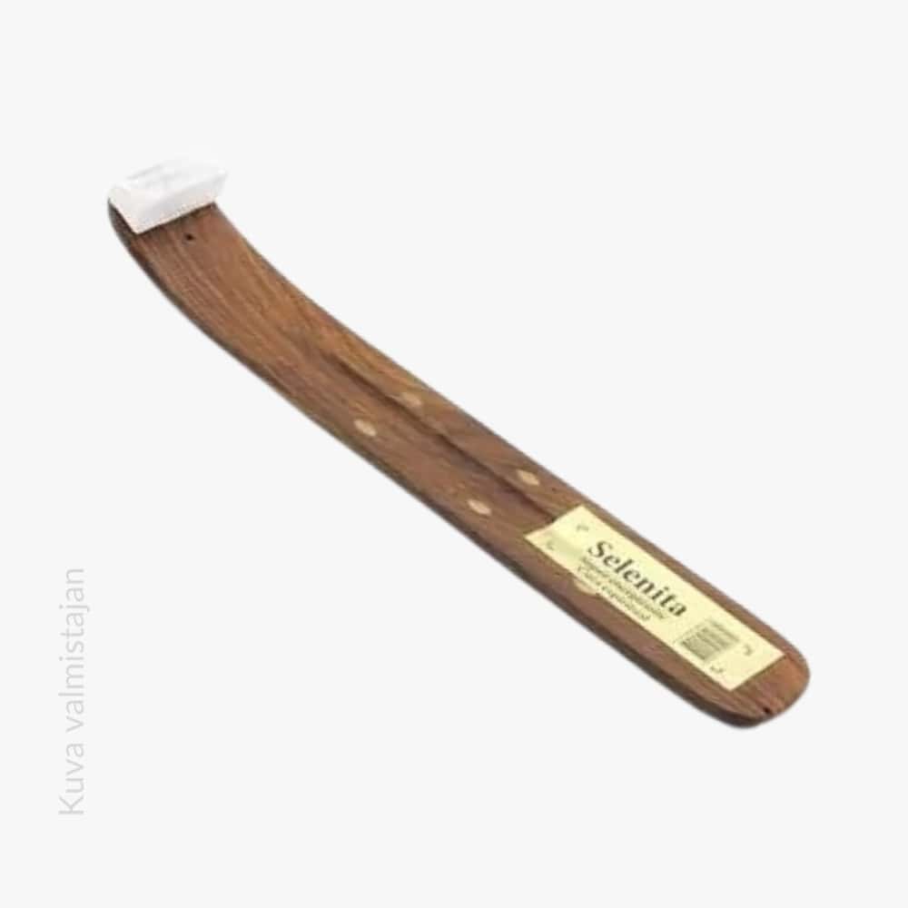 Mangopuisessa suitsuketelineessä kaiverrettu ura, johon suitsuketikun tuhka kerääntyy siististi. Päässä Seleniitti puolijalokivi raakapala. Reunoissa messinkiset tähdet. Mukavan reilun kokoisen suitsukesuksen pituus 26 cm, leveys noin 4 cm.