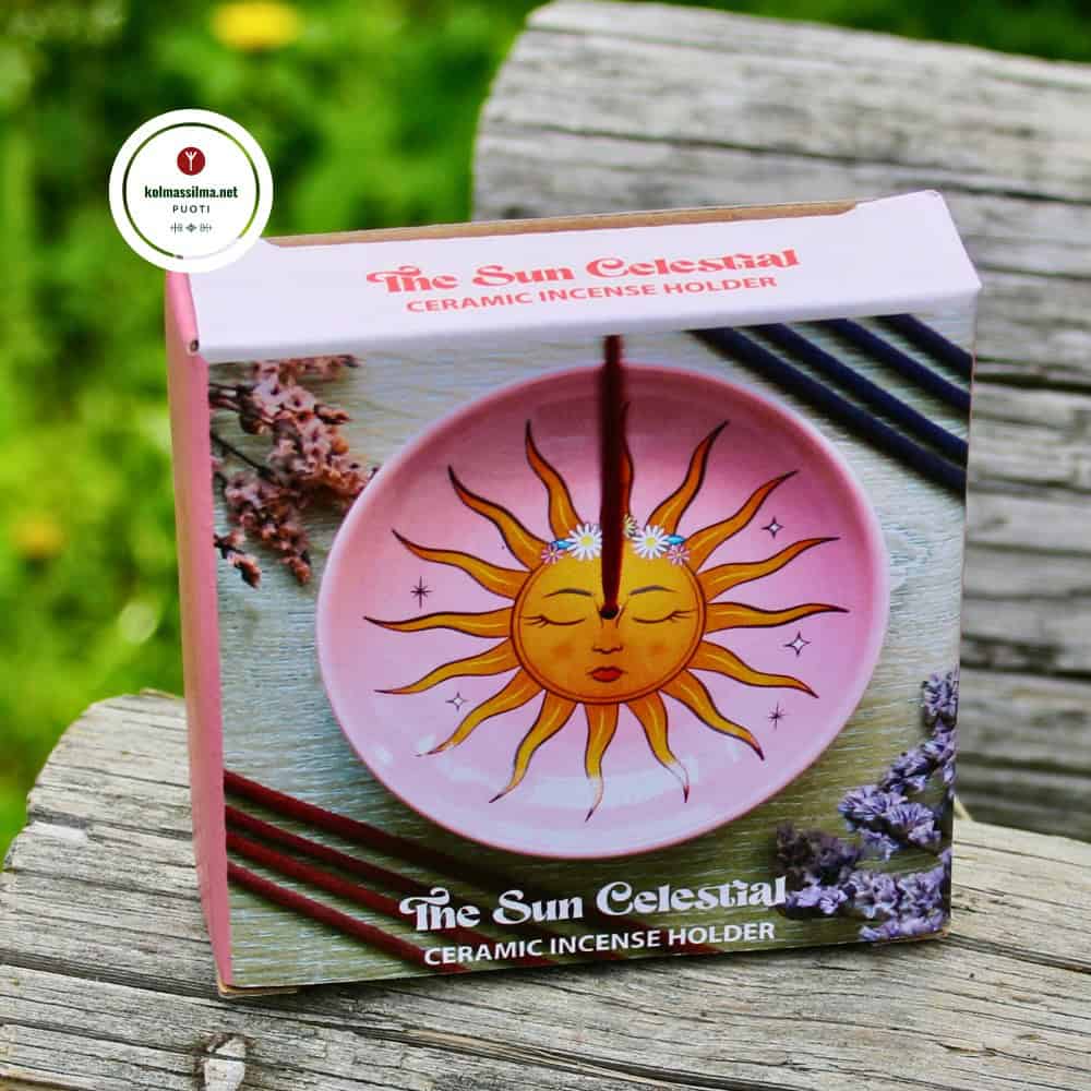 Keraaminen suitsukealusta on koristeltu värikkäällä auringon symbolilla, joka on saanut inspiraationsa The Sun -tarotkortista. Aseta suitsuketikku keskellä olevaan aukkoon tai polta alustalla kartiosuitsukkeita. Voi käyttää myös pienten aarteiden säilyttämiseen korulautasen tapaan. Pienen ja sievän astian halkaisija 9 cm.